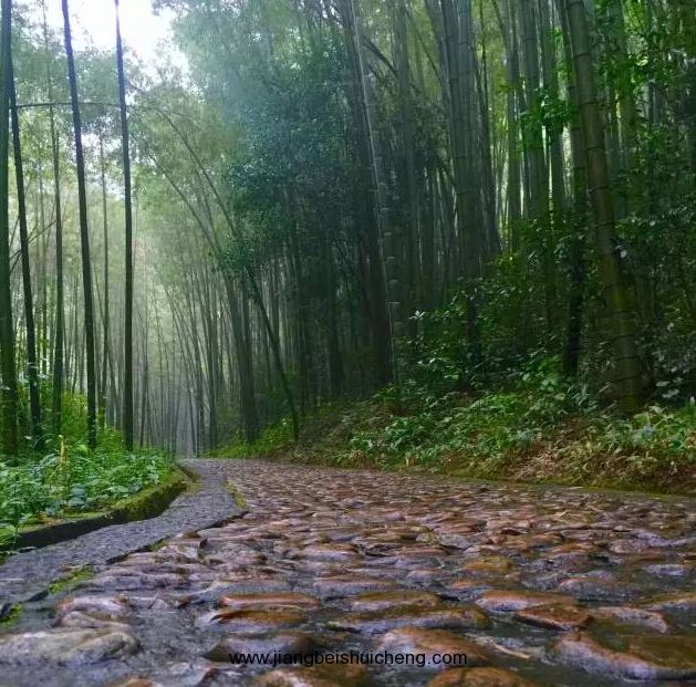 兩側(cè)的竹林枝葉相連遮天閉日,感覺黑幽幽。走在路上鞋子與大地的吻跡,心里特別舒服。