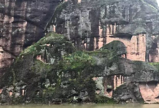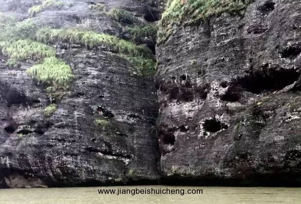 龍虎山崖墓數(shù)以百計,全部鑲嵌在仙水巖一帶的懸崖峭壁之上。仙水巖諸峰峭拔陡險,巖壁光滑平展,巖腳下便是瀘溪河,臨水懸崖絕壁上市滿了各式各樣的巖洞,獨特的地理環(huán)境是龍虎山崖墓的基本成因。