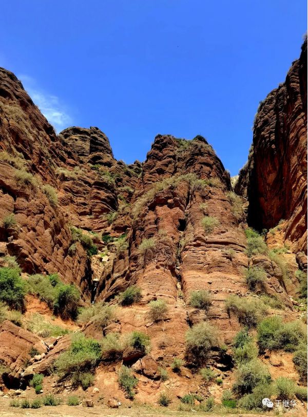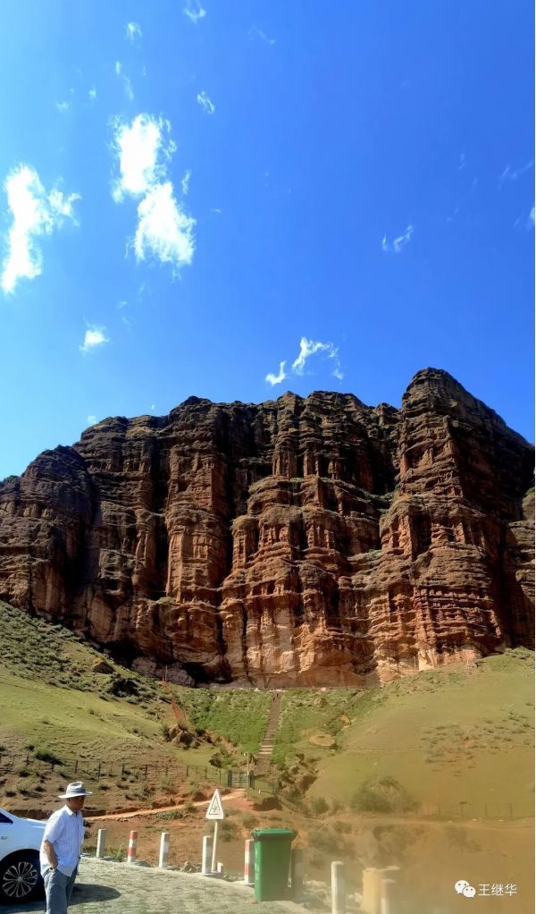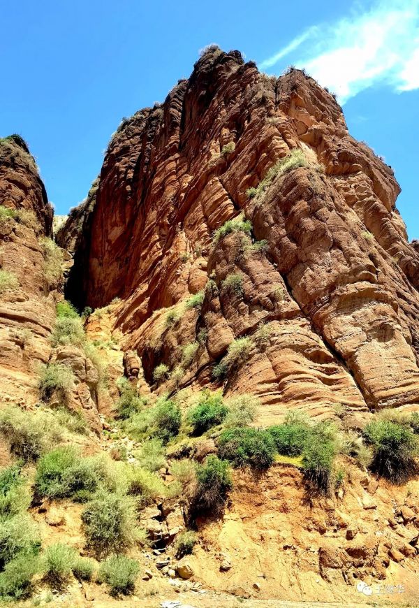 這個(gè)景區(qū)叫赤壁西湖,山峰是紅色,它的紋理比較特別,山水畫里邊兒28種存法,也表現(xiàn)不完全的風(fēng)貌。,縱橫交錯(cuò),成成疊疊,點(diǎn)點(diǎn)滴滴,宏偉總不乏婉約,剛硬中不乏圓潤。在藍(lán)天白云的映襯下,別有一番風(fēng)味兒。