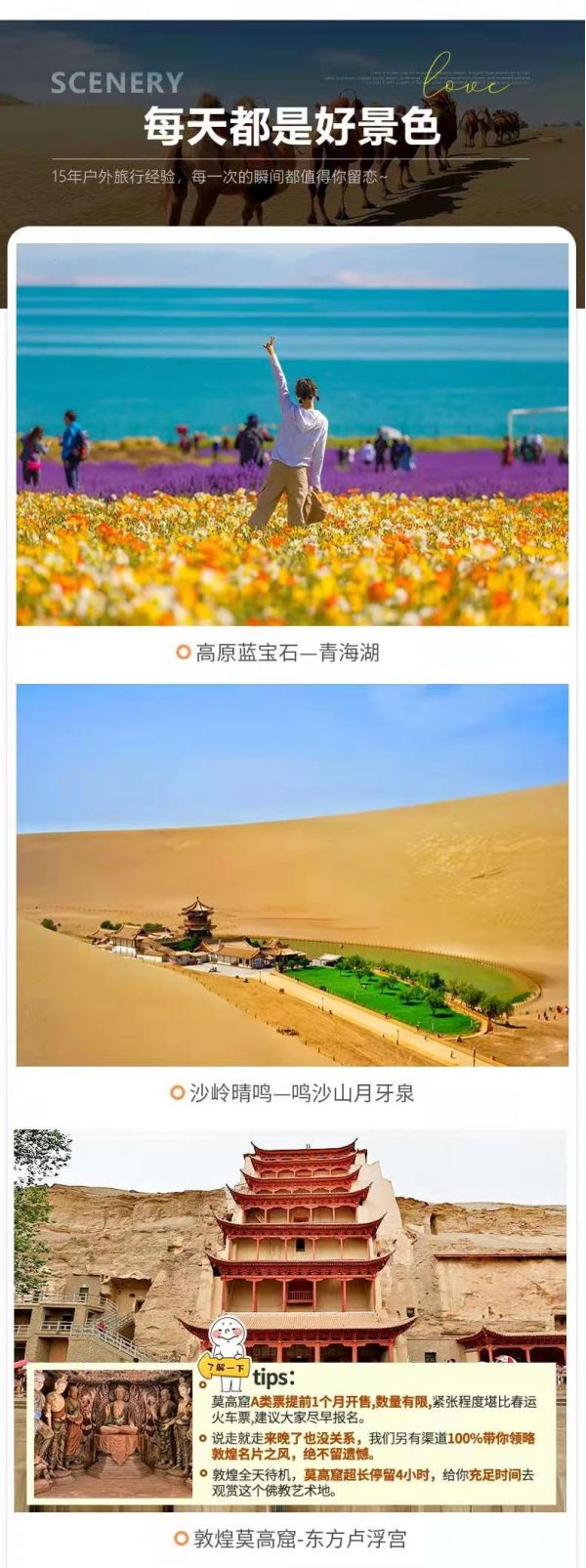 住宿:行程所列6晚住宿。我們會(huì)提供行程內(nèi)展示照片的酒店或其他條件相似酒店,但因沿途條件有限,如酒店設(shè)施達(dá)不到您的期望,請(qǐng)您諒解。西寧:自然里酒店、星程、麗豪、宜必思尚品或其它同級(jí)酒店德令哈:柏菲大酒店、派派、天鴻或其它同級(jí)酒店大柴旦:高原藍(lán)假日酒店、曬北、碧海云天或其它同級(jí)酒店茶卡:星入海、三匯、烏蘭山水、尚客優(yōu)或其它同級(jí)酒店敦煌:賽爾迪酒店、天潤(rùn)頤和酒店、富麗華國(guó)際、禧來(lái)敦或其它同級(jí)酒店張掖:柏菲大酒店、派派、天鴻或其它同級(jí)酒店服務(wù):由經(jīng)驗(yàn)豐富的司機(jī)提供向?qū)Х?wù),司機(jī)非導(dǎo)游,不進(jìn)景區(qū),敬請(qǐng)諒解。