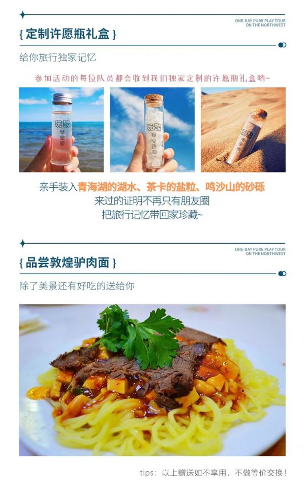 2.當(dāng)天一路人煙稀少,請大家務(wù)必準(zhǔn)備好飲用水及干糧。柴達木盆地公路開闊,行車速度較快,自由活動時一定聽從領(lǐng)隊指揮,注意安全.