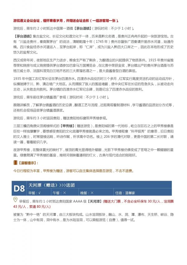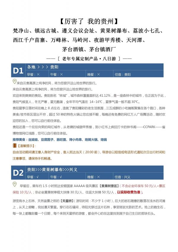 貴州8日游 聊城發(fā)團(tuán) 純玩 無購物 凈山 鎮(zhèn)遠(yuǎn)古城 遵義會議會址 黃果樹瀑布 荔波小七孔 江千戶苗寨 萬峰林 馬嶺河 夜游甲秀樓 天河潭 茅臺酒鎮(zhèn) 茅臺鎮(zhèn)酒廠 發(fā)團(tuán)時(shí)間 20230615-20230622 價(jià)格 4480 報(bào)名電話 0635 8681234
