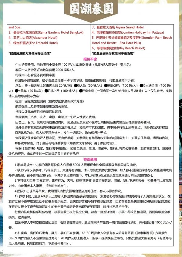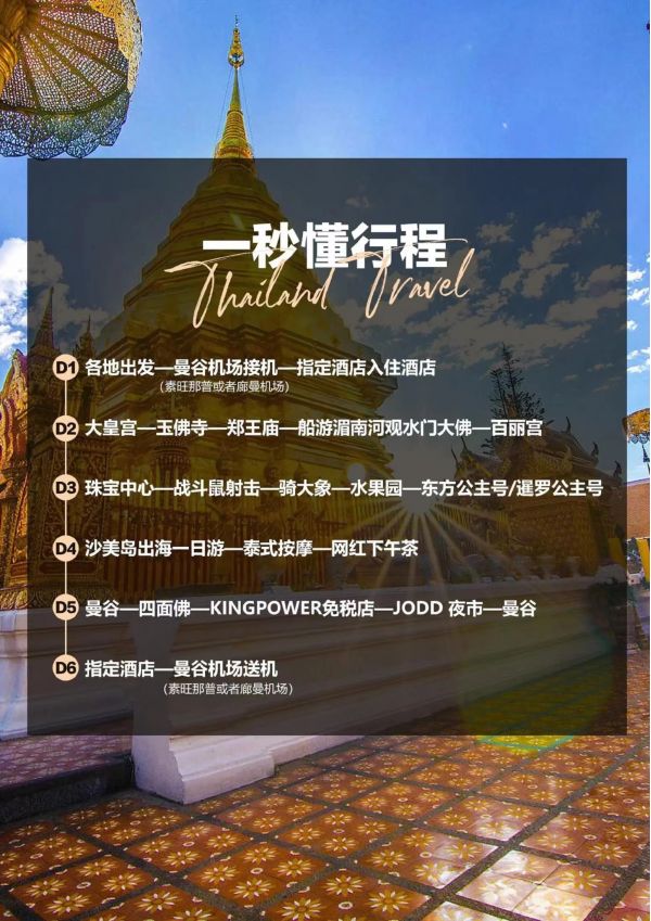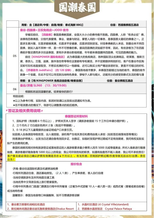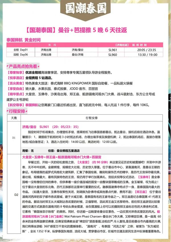 泰國6日游 聊城發(fā)團(tuán) 純玩 無購物 曼谷 芭提雅 沙美島 ...... 發(fā)團(tuán)時間 20230703-20230708 20230710-20230715 價格 4280 4580 報名電話 0635 8681234