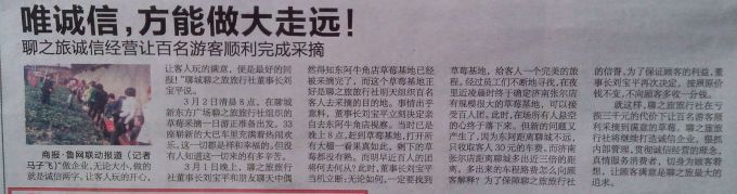 3月1日晚上,聊之旅旅行社董事長(zhǎng)劉寶平和朋友聊天中偶然得知東阿牛角店草莓基地已經(jīng)被采摘完了,而這個(gè)草莓基地正好是聊之旅旅行社明天組織百名客人去采摘的目的地。事情出乎意料,董事長(zhǎng)劉寶平當(dāng)即立刻決定親自去東阿牛角店視察。當(dāng)時(shí)已是晚上8點(diǎn),趕到草莓基地,打開所有大棚一看果真如此,剩下的草莓都沒有熟。而明早近百人的團(tuán)將何去何從?此時(shí)此刻,董事長(zhǎng)劉寶平當(dāng)機(jī)立斷:無論如何,一定要找到草莓基地,給客人一個(gè)完美的旅程。經(jīng)過員工們不斷地尋找,在夜里近凌晨時(shí)終于確定濟(jì)南張爾店有規(guī)模很大的草莓基地,可以接受百人團(tuán)。此時(shí),在場(chǎng)所有人懸空的心終于落下來。但新的問題又產(chǎn)生了,因?yàn)闁|阿距離聊城不遠(yuǎn),只收取客人30元的車費(fèi)。而濟(jì)南張爾店距離聊城多出近三倍的距離,多出來的車程路費(fèi)怎么向顧客解釋?為了保障聊之旅旅行社的信譽(yù),為了保證顧客的利益,董事長(zhǎng)劉寶平再次決定,按照原價(jià)錢不變,不向顧客多收一分錢。