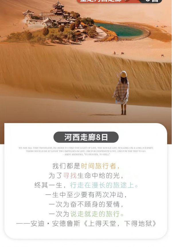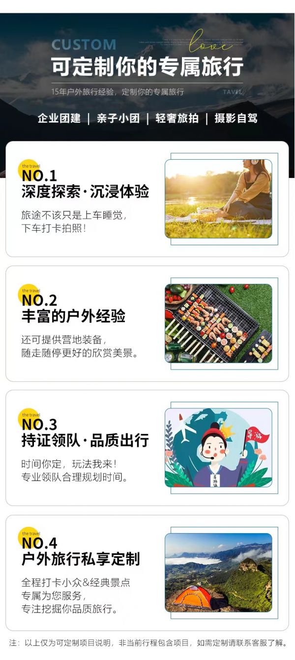 私人訂制:我們業(yè)務(wù)范圍囊括了全國(guó)各大城市,川西、西北、新疆、西藏,在路上永遠(yuǎn)有我們的身影。我們將為每一個(gè)有定制需求的你策劃出獨(dú)屬于自己的完美旅行。