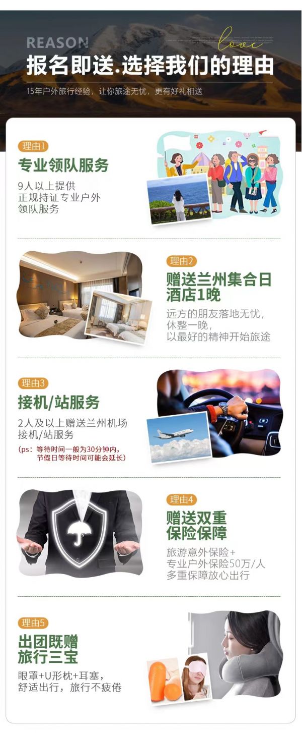 (5)贈(zèng)送2人及以上蘭州市區(qū)接火車(chē)服務(wù);4人以上接機(jī)服務(wù),23點(diǎn)后由于運(yùn)管規(guī)定不能接機(jī)/接站,敬請(qǐng)諒解;服務(wù):9人及以上,提供持證正規(guī)導(dǎo)游服務(wù);8人及以下,由經(jīng)驗(yàn)豐富的司機(jī)帶隊(duì),無(wú)單獨(dú)導(dǎo)游服務(wù),請(qǐng)諒解。保險(xiǎn):贈(zèng)送高額旅游意外保險(xiǎn),旅游意外保險(xiǎn)最高賠付50萬(wàn)元/人,贈(zèng)送旅行社責(zé)任險(xiǎn),贈(zèng)送車(chē)輛保險(xiǎn);因道路交通事故造成的客人意外傷害,按《道路交通事故處理方法》由保險(xiǎn)公司賠償,我方不承擔(dān)另外的賠償責(zé)任;如有需要,游客可自行購(gòu)買(mǎi)其他保險(xiǎn)。