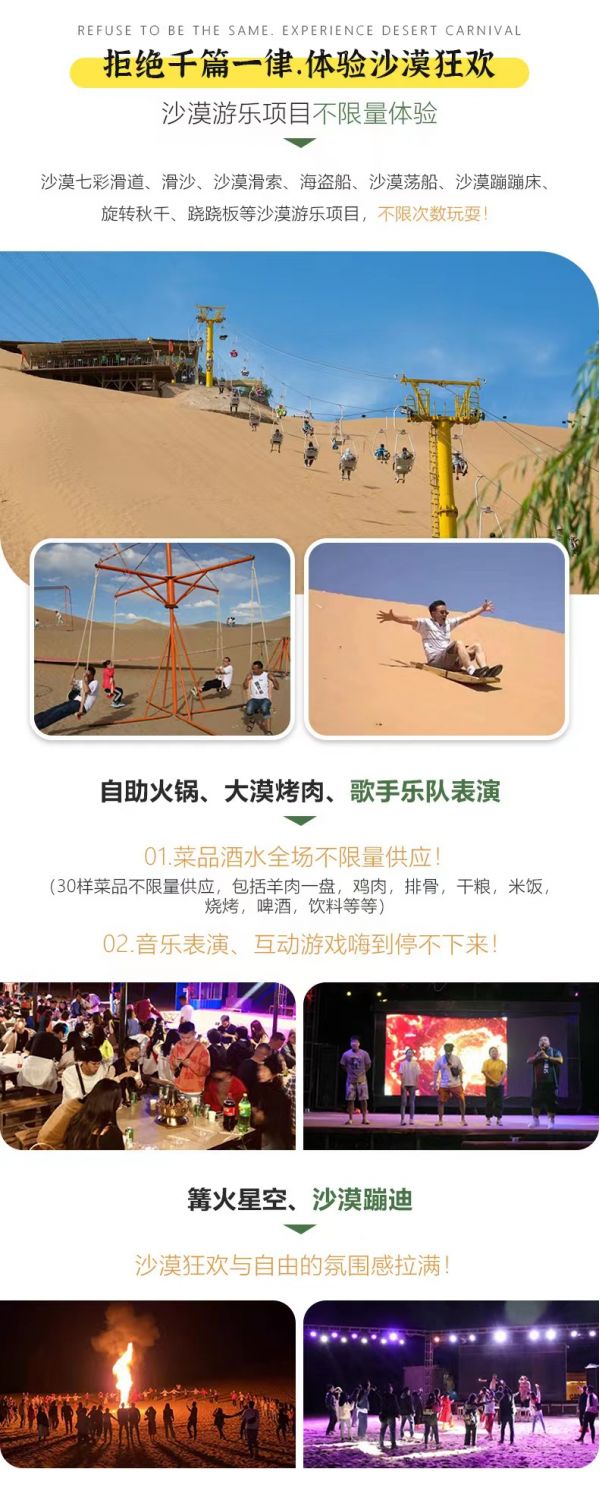 今晚我們將在此開(kāi)啟沙漠狂歡party!坐上沙漠摩托、沙漠越野,專(zhuān)業(yè)騎手、專(zhuān)業(yè)裝備帶你來(lái)一次刺激的沙漠沖沙體驗(yàn),在沙漠中放聲尖叫;還有沙漠七彩滑道、滑沙、沙漠滑索、海盜船、沙漠蕩船、沙漠蹦蹦床、旋轉(zhuǎn)秋千、蹺蹺板等沙漠游樂(lè)項(xiàng)目讓你嗨翻沙漠。日落之后沙漠盛宴來(lái)襲,自助火鍋、大漠烤肉......菜品酒水全場(chǎng)不限量供應(yīng)。沙漠夜宴進(jìn)行時(shí)還有演員歌手表演節(jié)目,做互動(dòng)游戲。吃飽喝足,酒氣微醺,在沙漠縱情享受一場(chǎng)篝火晚會(huì)、沙漠蹦迪,沙漠狂歡與自由的氛圍感拉滿??駳g結(jié)束后,需要沙漠露營(yíng)的客人開(kāi)始領(lǐng)取露營(yíng)裝備(包括帳篷,棉被),不露營(yíng)客人,返回酒店休息。