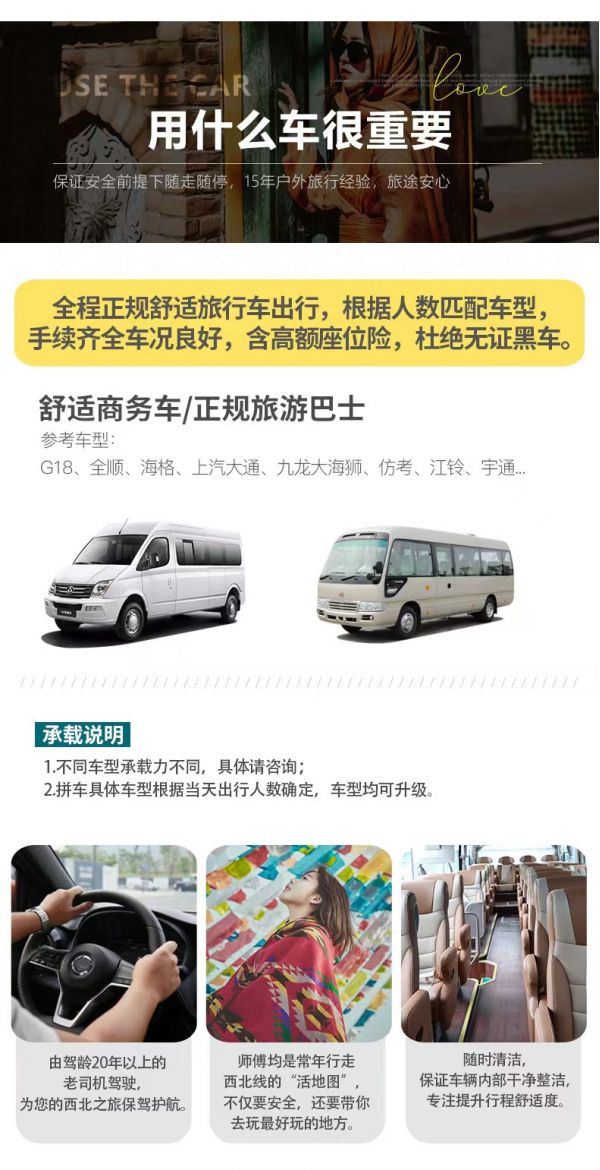 全程正規(guī)舒適旅游巴士,保證一人一正座位,車(chē)型大小根據(jù)實(shí)際人數(shù)安排,且由駕駛經(jīng)驗(yàn)豐富的司機(jī)為您的出行保駕護(hù)航(報(bào)價(jià)包含車(chē)費(fèi)、油費(fèi)、停車(chē)費(fèi)、維修費(fèi)及司機(jī)勞務(wù)費(fèi))。住宿:行程所列7晚住宿。我們會(huì)提供行程內(nèi)展示照片的酒店或其他條件相似酒店,但因沿途條件有限,如酒店設(shè)施達(dá)不到您的期望,請(qǐng)您諒解。參考酒店如下: