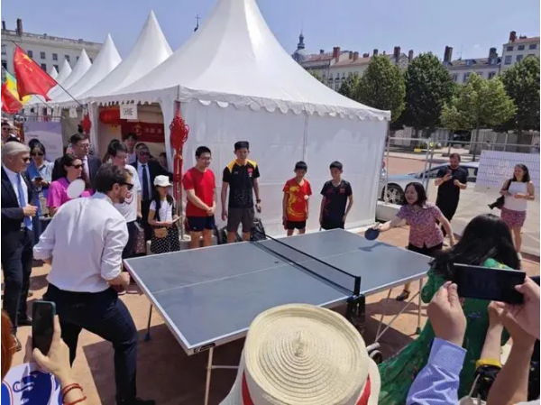 陸青江總領(lǐng)事陪同里昂市長(zhǎng)杜塞、副市長(zhǎng)茲多羅夫佐夫等來賓參觀中國(guó)展棚,法國(guó)小熊貓學(xué)校鄧翔教練帶領(lǐng)小熊貓乒乓球隊(duì)的三位省級(jí)冠軍球員陳玉麒、陳玉麟和柯弘毅組成“小熊貓乒乓天團(tuán)”,現(xiàn)場(chǎng)做了精彩表演,并和市長(zhǎng)及總領(lǐng)事進(jìn)行乒乓球?qū)Υ蚓毩?xí)。隨后,杜塞市長(zhǎng)還興致勃勃的同陸總領(lǐng)事打起乒乓,并表示充分感受到中華文化的博大精深和中華體育之美。
