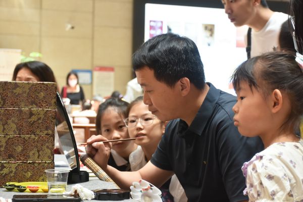 在平遙推光漆器髹飾技藝體驗(yàn)區(qū),活潑可愛(ài)的貓咪、亭亭玉立的荷花,活靈活現(xiàn)地展現(xiàn)在漆器上。在平遙木雕神像傳統(tǒng)技藝體驗(yàn)區(qū),孩子們細(xì)細(xì)雕刻著手中的作品,沉浸在創(chuàng)作的樂(lè)趣中。在晉中面塑技藝體驗(yàn)區(qū),不少觀眾親手制作出惟妙惟肖的專屬面塑人物。在平遙傳統(tǒng)(白)銅器制作技藝體驗(yàn)區(qū),在陣陣“叮叮當(dāng)當(dāng)”的金屬敲擊聲中,一件件亮閃閃的生肖掛件制作完成。在堆繡傳統(tǒng)制作技藝體驗(yàn)區(qū),精美細(xì)膩的堆繡也吸引了不少人圍觀,大家紛紛向傳承人詢問(wèn)剪裁和針?lè)ǖ姆椒记伞?