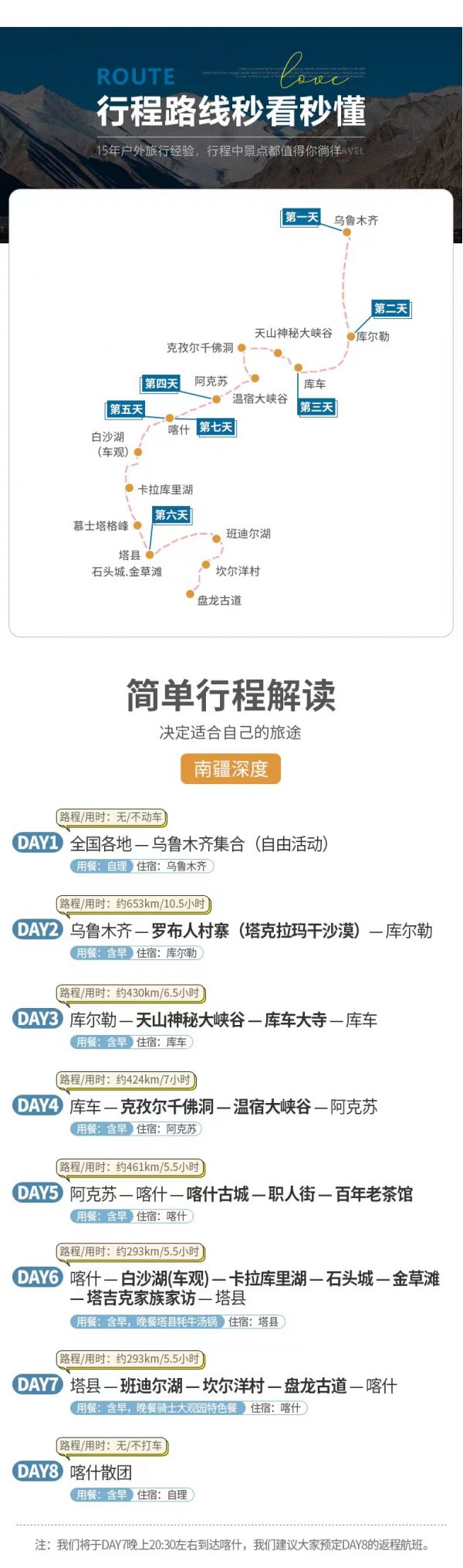 當(dāng)天車程較長,從北疆穿越天山甘溝進入南疆腹地,氣候變化較大,請適當(dāng)增減衣物,注意補充水分??商崆百徺I一些零食,以備不時之需。