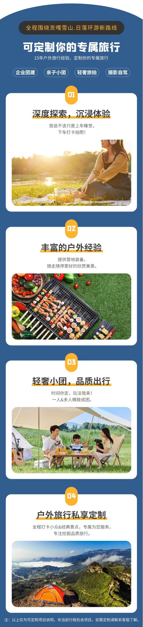 私人訂制:我們業(yè)務(wù)范圍囊括了全國各大城市,川西、西北、新疆、西藏,在路上永遠(yuǎn)有我們的身影。我們將為每一個(gè)有定制需求的你策劃出獨(dú)屬于自己的完美旅行。