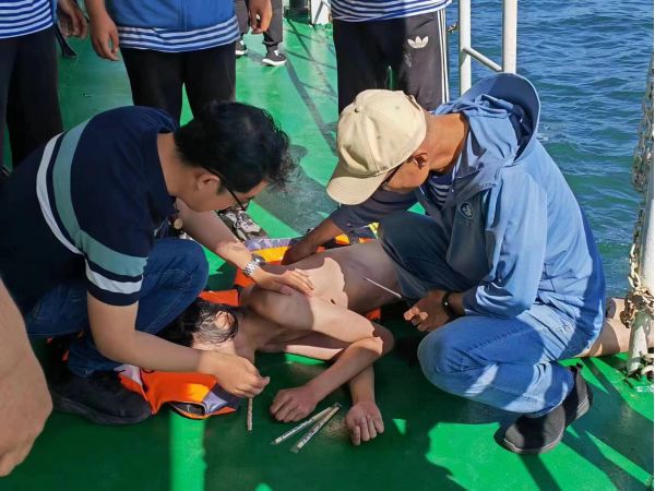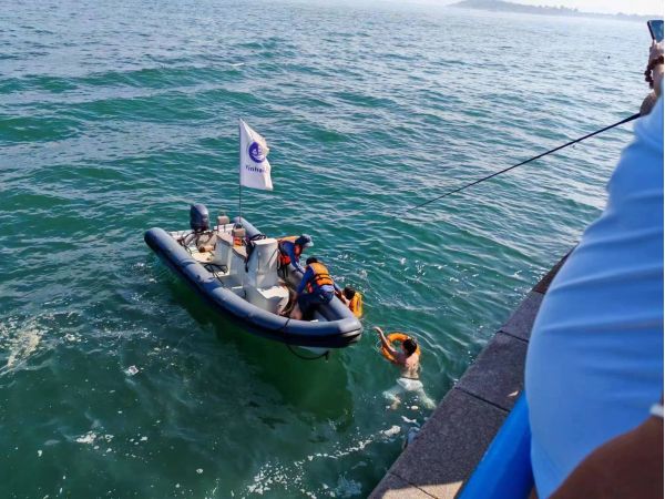據(jù)了解,三名落水者均是大學生,一名大學生先落水,兩名學生先后去救助均遇險。當時海上風大水涼,一名落水者已經(jīng)失去意識,另外兩名也體力嚴重透支。在聽到呼救聲時,銀海格曼海上交通娛樂中心經(jīng)理賈平正在碼頭工作,憑借多年海上救援的經(jīng)驗,他立刻安排帆船部經(jīng)理焦寅生、船長劉海天兩人駕艇迅速前往落水者海域?qū)嵤┖I暇仍⒂脤χv機全程指揮了海上救援過程。當時,兩名船長拋出救生圈后,先將處于昏迷狀態(tài)的青年營救上船進行控水急救,隨后將另外兩名落水者營救上岸,整個海上救援總共用時三分鐘。三名落水者被救上岸后,等在岸上的賈平和船長王其剛立即對落水者實施搶救,直至三名學生最終恢復(fù)生命體征,脫離危險。在場目睹救人的市民和游客對這種見義勇為的行為紛紛點贊拍手叫好。
