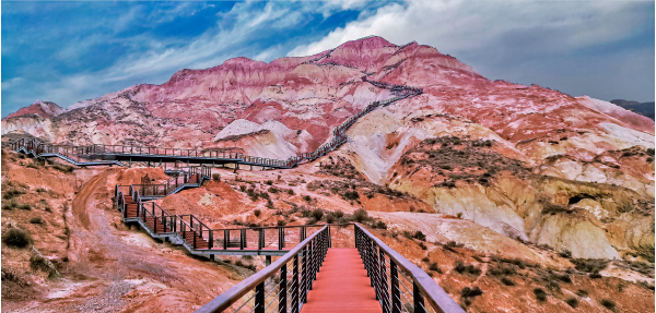 沿著棧道蜿蜒向上,隨著視角逐漸抬高眼前的水墨丹霞景區(qū)美景,絲路霞光、九色丹青、丹頂攬勝,更遠(yuǎn)方景區(qū)的天際線盡收眼底。