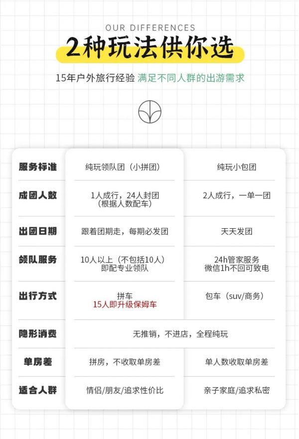 單房差:原則上本線路不收自然單房差,如果隊員要求自己單獨住一間房,請在報名時告知客服,并自補單房差;如果在集合日或行程進行中選擇單獨住一間房,則需補一間房的費用(單房差*2)。出團時間不同,單房差價格不同,具體價格請參看【活動批次】,或者直接咨詢客服;