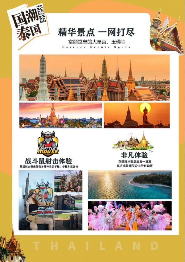 酒店早餐后前往參觀【珠寶展覽中心】 (約 180 分鐘) 此有各式各樣的紅寶石《代表愛(ài)情及幸福,象征 著熱情、仁愛(ài)、威嚴(yán)》、藍(lán)寶石《代表貴族,象征著慈愛(ài)、誠(chéng)實(shí)、德望》以及黃寶石《代表招財(cái), 象征著健康、長(zhǎng)壽》,可以在這里選擇到適合自己喜愛(ài)的寶石。泰國(guó)被公認(rèn)為是世界上首屈一指的 寶石及珠寶中心之一,經(jīng) ISO-9001:2000品質(zhì)認(rèn)證?!?strong>戰(zhàn)斗鼠射擊】戰(zhàn)鼠射擊俱樂(lè)部位于芭提雅,占地20萊,是一個(gè)室內(nèi)射擊館, 擁有IDPA及IPSC訓(xùn)練資質(zhì)。館內(nèi)各項(xiàng)設(shè)施齊全,整個(gè)區(qū)域都安裝有空調(diào),設(shè)有專(zhuān)門(mén)的人休閑放松區(qū)域。 戰(zhàn)鼠射擊俱樂(lè)部供各種種類(lèi)的手槍?zhuān)綐尯亡睆棙專(zhuān)ǎ篠mith&Wesson 686和1522,Glock 9mm,Colt Gold Cup 45或CZ 455。子彈規(guī)格范圍有.22LR,.38ACP,.9MM,.45 ACP等規(guī)格。暹羅爽泰莊園【騎大象】坐在象背上起起伏伏,穿梭在熱帶雨林中,您仿佛進(jìn)入了一個(gè)天然大氧吧,靜下心來(lái)還能聆聽(tīng)到叢林深處的幽幽鳥(niǎo)啼和潺潺溪流聲,可別忘了和憨態(tài)可掬的大象合影留念?!?strong>熱帶水果園】果園占地面積有幾百畝大,里面栽種著各五花八門(mén)的熱帶水果,有葡萄、山竹、榴蓮、紅毛丹、椰青和火龍果等。味道鮮美的水果任您品嘗,還可以享受回歸大自然的樂(lè)趣。【東方公主號(hào)或暹羅公主號(hào)】聞名遐邇的并不是暹羅灣夜景,而是東方公主們 的美麗。泰國(guó)人妖的精湛歌舞表演令很多人對(duì)臺(tái)上的麗人們雌雄難辨,在船上我們將與她們近距離接觸。為您端菜、 與您共舞的都是盛裝美麗的人妖公主,在此提醒大家,若被人妖“騷擾”,最好定氣凝神、泰然處之。