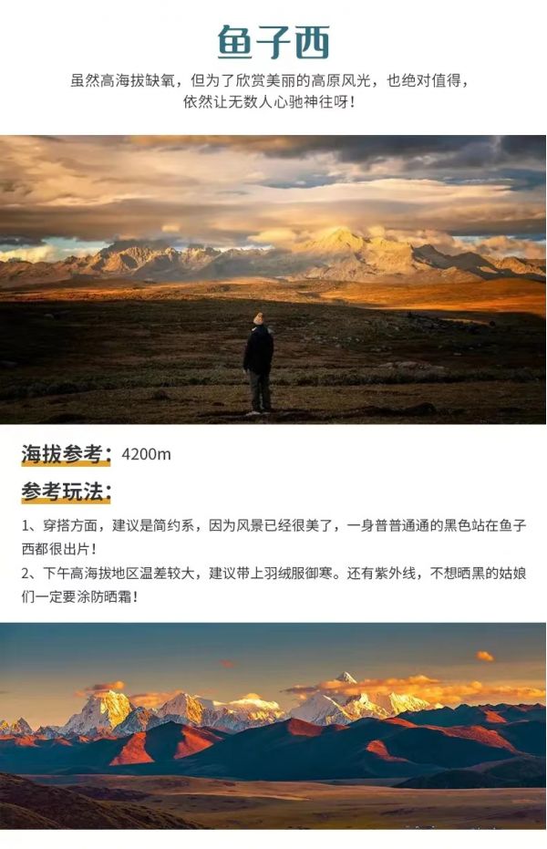溫馨提示:(1)冬季11月-次年3月如因魚子西/格底拉姆封山無法前往,則將魚子西/格底拉姆景點(diǎn)換為八郎生都。