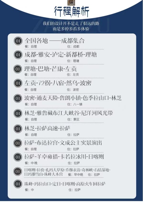 成都—雅安瀘定—新都橋--理塘-巴塘—芒康—左貢--72拐--八宿—然烏—波密--通麥天險--魯朗小鎮(zhèn)--色季拉山口--喬穆永青--奇林峽--定結(jié)濕地--日瑪那雪山--珠峰大本營--林芝-雅魯藏布大峽谷--尼洋河風(fēng)光帶--林拉高速--拉薩-布達(dá)拉--宮羊卓雍措--卡若拉冰川--日喀則--拉孜--孔瑪大草原