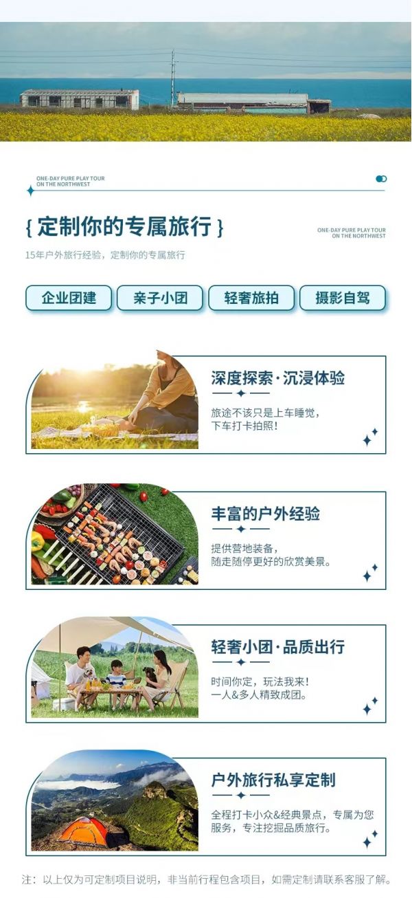 私人訂制:我們業(yè)務(wù)范圍囊括了全國(guó)各大城市,川西、西北、新疆、西藏,在路上永遠(yuǎn)有我們的身影。我們將為每一個(gè)有定制需求的你策劃出獨(dú)屬于自己的完美旅行。