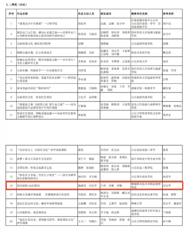 由山東省總工會、山東省文化和旅游廳、山東省新舊動能轉(zhuǎn)換綜合試驗(yàn)區(qū)建設(shè)辦公室、山東省人力資源和社會保障廳、山東省教育廳、山東省農(nóng)業(yè)農(nóng)村廳、山東省精品旅游促進(jìn)會共同主辦,山東省精品旅游促進(jìn)會組織實(shí)施的“2023第四屆山東省研學(xué)旅行創(chuàng)新線路設(shè)計(jì)大賽暨首屆山東省研學(xué)旅行指導(dǎo)師技能大賽”的評審工作,嚴(yán)格按照統(tǒng)一報(bào)名參賽、網(wǎng)絡(luò)投票、專家評審、組委會審核等程序,研究確定了獲獎名單。聊城職業(yè)技術(shù)學(xué)院旅游管理系師生工作室團(tuán)隊(duì)不負(fù)眾望,喜獲“2023第四屆山東省研學(xué)旅行創(chuàng)新線路設(shè)計(jì)大賽”二等獎。