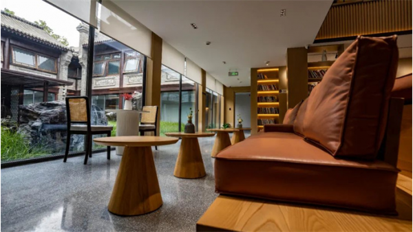 海源雅集不負(fù)其名,在設(shè)計風(fēng)格上融入中國傳統(tǒng)文化的元素,取“山水相問”之意境,松柏、石橋、山水、亭榭寫意于方靜之內(nèi),呼應(yīng)“天圓地方”,極具巧思。在功能分區(qū)上,既有禪意的茶舍,又有安靜閱讀的書吧,還有較為私密的小包間,滿足不同需求。房間分別用春澤、夏嬋、雁秋、冬歸用作包間的名稱,特別有禪意。酒店的大廳就是書房,一頁頁書本形狀的吊燈,像一片片潔白輕盈的羽毛掛在房頂,讓人望之生靜,整顆心都安靜下來。