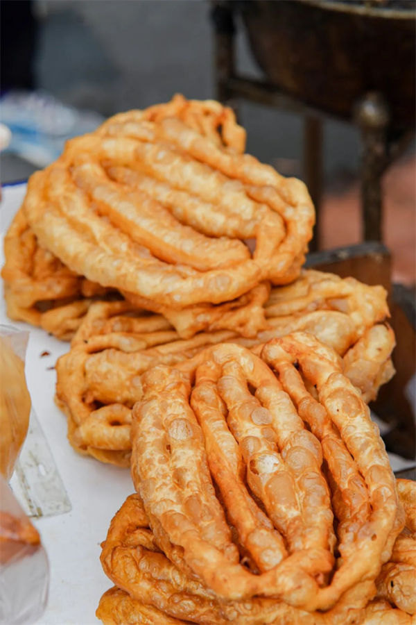 在聊城,有一種地道的街邊小吃,雖不起眼但味道十分誘人,那就是老一輩聊城人都十分的熟悉的八批果子?!?strong>八批果子”形如其名,炸制成的果子分為八條,兩端相連,呈現(xiàn)橢圓形,當(dāng)它放入油鍋中逐漸變色、膨脹,油炸食品的獨特香味也愈來愈深,輕輕扯下一批放入口中,滿口酥脆,食之難忘。八批果子加到燒餅中一起吃,是聊城人非常喜歡的一種搭配,燒餅的酥軟加上八批果子的酥脆營造出獨特的口感,吃過一口便唇齒留香。