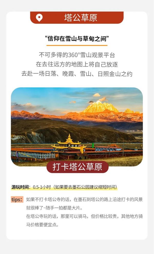 ? 【塔公草原】這是一處令人驚喜的取景地,塔公沿路野花盡享盛放,綠茵茵的草地上偶爾有白底藍(lán)色圖案的賬蓬隨意地支著,可能還會有牦牛、馬或羊等悠閑吃草的身影闖進(jìn)視野里,你的心情也會變得明朗而隨意起來,游覽時(shí)間約1H。