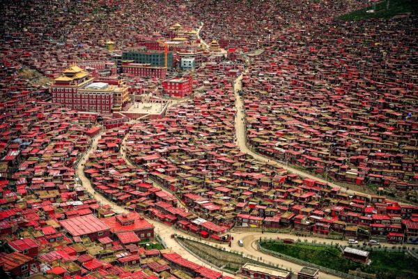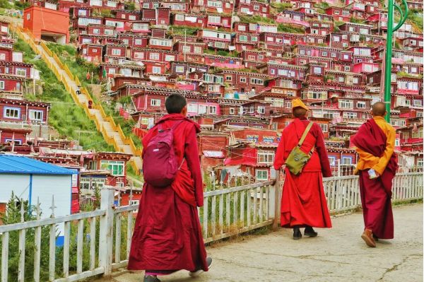 ? 震撼的佛國畫卷逐漸展開--入目處盡是朱紅的佛色,裹著紅袍的僧人在其間穿行,空氣里彌漫著佛香。在金紅相間的佛學(xué)院漫步,學(xué)著僧人面目虔誠地轉(zhuǎn)經(jīng)、朝拜,在觸動(dòng)轉(zhuǎn)經(jīng)筒的旋轉(zhuǎn)中,感受“信仰”的具象化。
