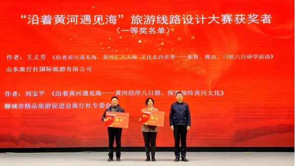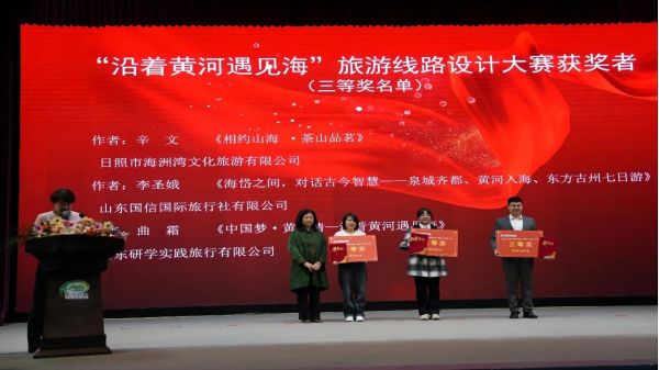 會(huì)上,對(duì)山東省“沿著黃河遇見(jiàn)?!甭糜尉€路產(chǎn)品設(shè)計(jì)大賽獲獎(jiǎng)?wù)哂枰宰C書(shū)和現(xiàn)金獎(jiǎng)勵(lì)。