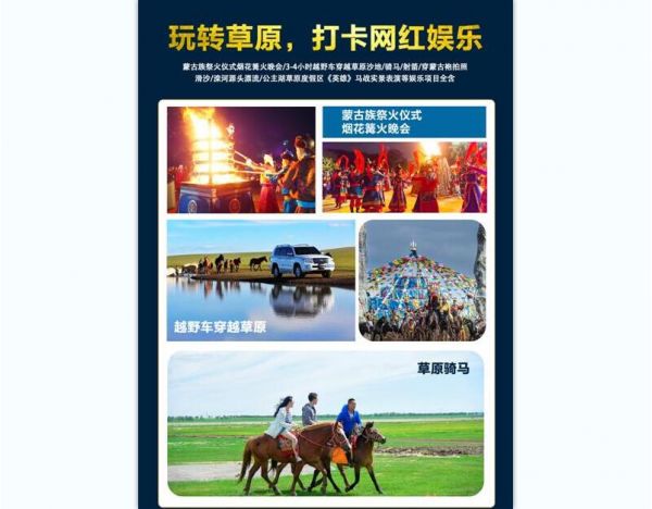 7:煙花篝火晚會(huì)、3-4小時(shí)越野車穿越草原沙地、騎馬、射箭、穿蒙古袍拍照、滑沙、灤河源頭漂流、公主湖草原度假區(qū)馬術(shù)劇《英雄》震撼的馬戰(zhàn)實(shí)景表演等娛樂項(xiàng)目全含。