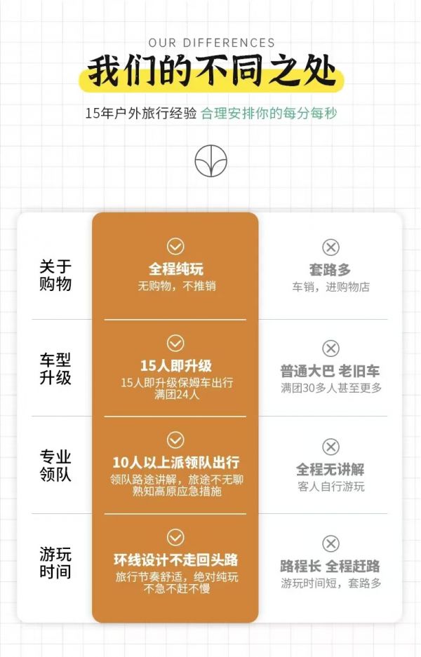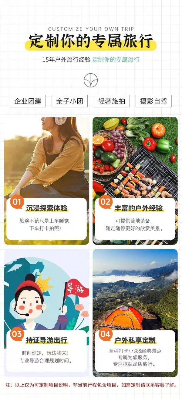 私人訂制:我們業(yè)務(wù)范圍囊括了全國各大城市,川西、西北、新疆,在路上永遠(yuǎn)有我們的身影。我們將為每一個(gè)有定制需求的你策劃出獨(dú)屬于自己的完美旅行。