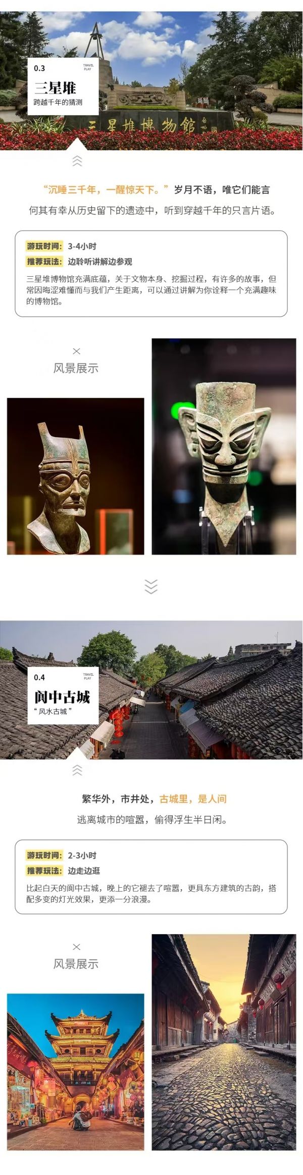 早晨從成都酒店出發(fā),大家相互認(rèn)識,相互熟悉,一路歡歌笑語,充滿期待。隨后抵達(dá)【三星堆博物館】開始參觀,三星堆古遺址距今已有3000至5000年歷史,是迄今在西南地區(qū)發(fā)現(xiàn)的范圍最大、延續(xù)時(shí)間最長、文化內(nèi)涵最豐富的古城、古國、古蜀文化遺址。在這批古蜀秘寶中,有許多光怪陸離奇異詭譎的青銅造型,有高2.62米的【青銅大立人】、有寬1.38米的【青銅面具】、更有高達(dá)3.95米的【青銅神樹】等,均堪稱獨(dú)一無二的曠世神品。而以流光溢彩的金杖為代表的金器,以滿飾圖案的邊璋為代表的玉石器,亦多屬前所未見的稀世之珍。游覽后繼續(xù)出發(fā),下午抵達(dá)【閬中古城】,古城山圍四面,水繞三方,有著2300多年的歷史,與安徽黃山的徽州古城、山西平遙的平遙古城和云南麗江的麗江古城并稱為中國四大古城,如果說麗江古城是風(fēng)花雪月,那么閬中古城便是人間煙火,古城里時(shí)不時(shí)飄出的陣陣醋香更是久久縈繞在心頭,古城所蘊(yùn)含的三國文化、春節(jié)文化、科舉文化更是值得深入探究。晚上我們?nèi)胱」懦侵苓?,比起白天的閬中古城,晚上的它褪去了喧囂,更具東方建筑的古韻,搭配多變的燈光效果,更添一分浪漫。