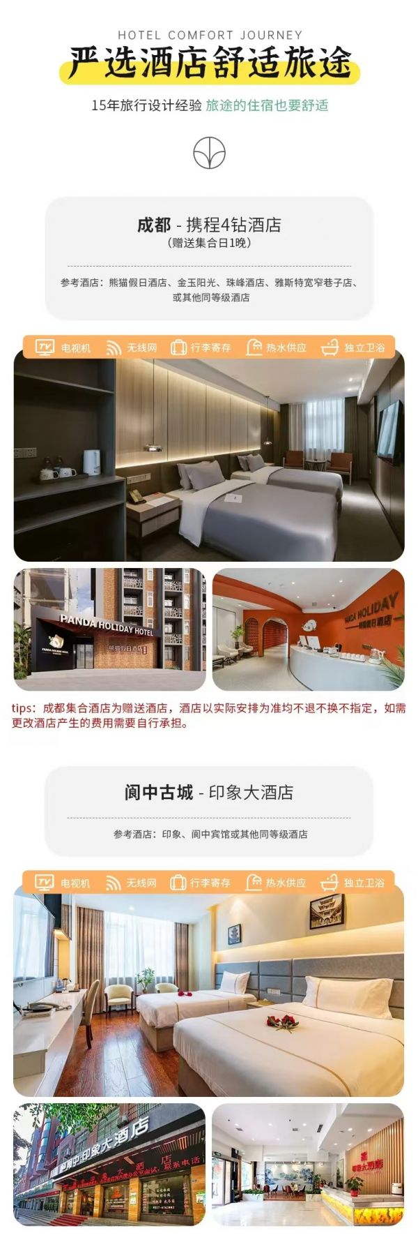 住宿:含全程4晚舒適酒店。(tips:成都集合酒店為贈送酒店,酒店以實(shí)際安排為準(zhǔn)均不換不退不指定,如要更改酒店產(chǎn)生的費(fèi)用需要自行承擔(dān)。)