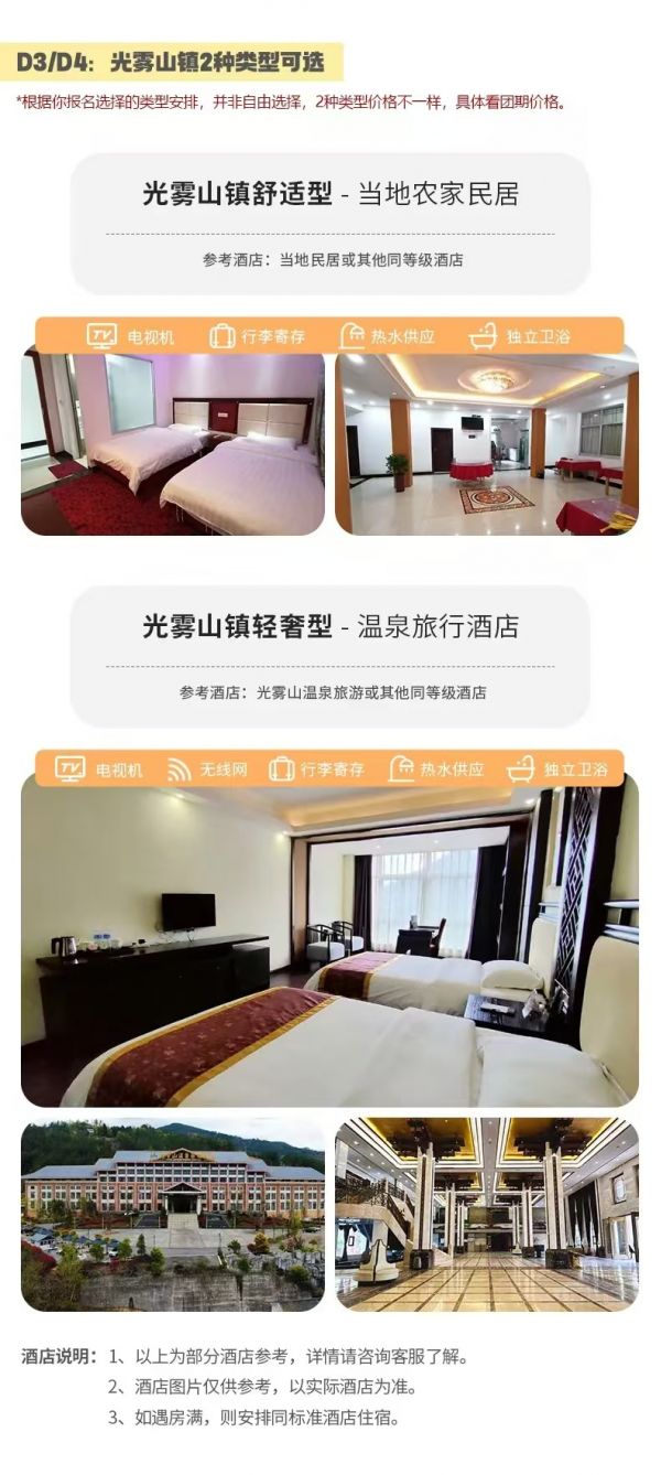 光霧山鎮(zhèn)因深處川東北山區(qū),住宿條件有限,請大家對酒店合理期待,但我們提供了輕奢/舒適2檔類型酒店可供選擇。