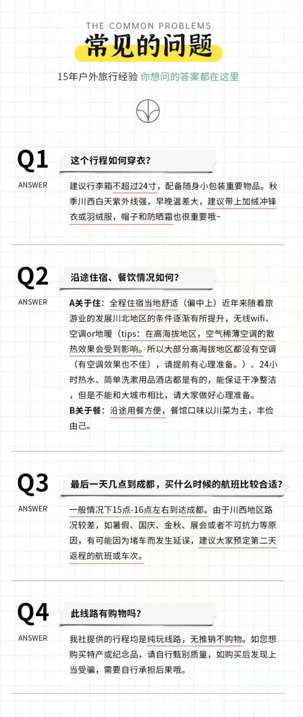 (2)正常情況下,抵達(dá)成都的時(shí)間為下午15:00-16:00,如果必須當(dāng)日離開,請定18:00以后的回程大交通,以免耽誤行程,敬請諒解;