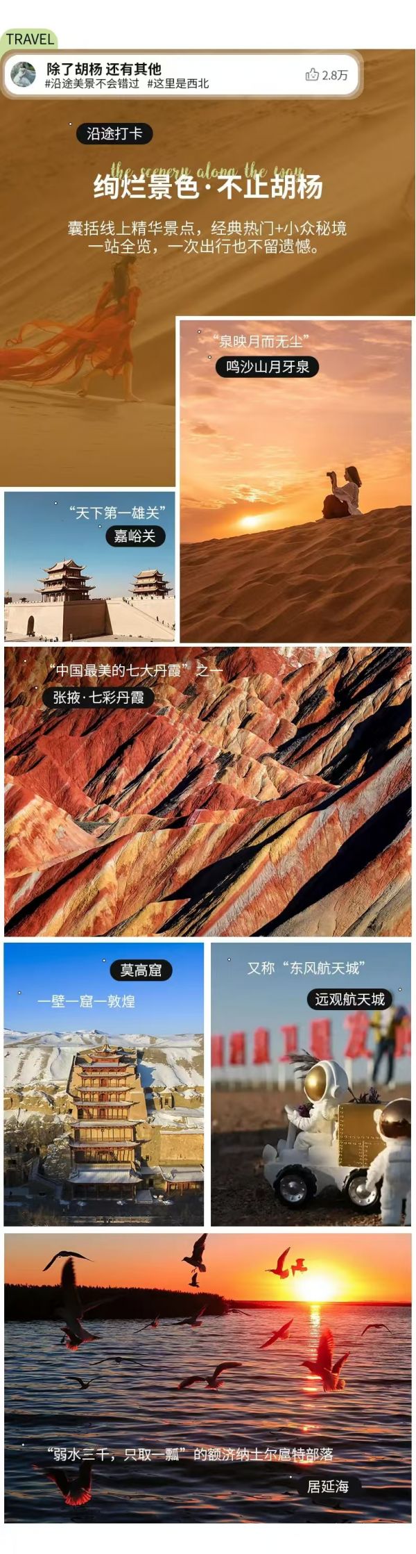今天辛苦大家起個(gè)早床,一起早起前往【居延?!颗臄z日出,日出大概在7點(diǎn)到7點(diǎn)半左右,居延海是《水經(jīng)注》里提到的弱水流沙之地,也是土爾扈特族發(fā)展的搖籃,現(xiàn)在是一片長滿蘆葦?shù)暮W?,日出時(shí)分場面相當(dāng)壯闊宏大。當(dāng)東方的太陽越出水面,霞光四射,水天瞬間都染成通紅,滿湖面的鷗鳥此起彼落,翱翔翻飛,海子周邊的蘆葦蕩隨風(fēng)飄動(dòng),這副日出盛景一定會(huì)讓你不悔起得早。然后開啟額濟(jì)納一日深度體驗(yàn)胡楊林之旅。