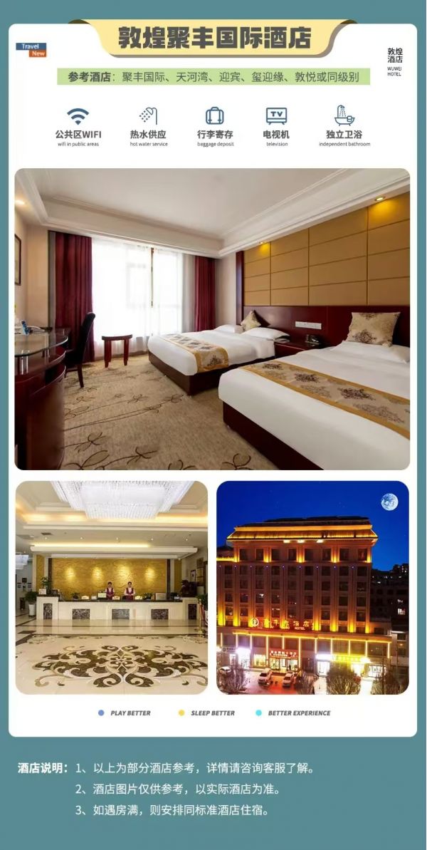 晚上,我們先到酒店辦理入住,放好行李休息片刻后,大家可以在【沙洲夜市】尋覓特色小吃,也可以看一場敦煌沉浸式演出《又見敦煌》(費(fèi)用自理),感受獨(dú)特的敦煌文化,深刻了解和認(rèn)識(shí)敦煌。