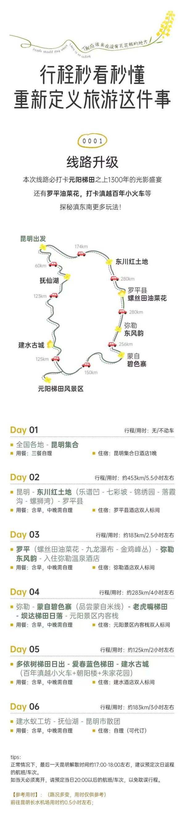 溫馨提示:春天的羅平滿眼都是金燦燦的黃,幾十萬(wàn)畝油菜花滿山偏野地開放,非常充裕的時(shí)間留給您盡情拍照,還為您準(zhǔn)備了特色民族服裝讓您盡情地放飛自我,凹造型!晚上彌勒的美食您也不能錯(cuò)過喲。