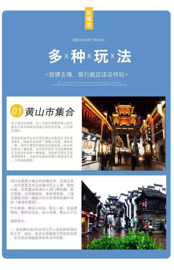 【集合地點(diǎn)】黃山市黎陽(yáng)老街,出發(fā)前三天短信通知酒店