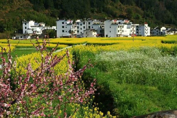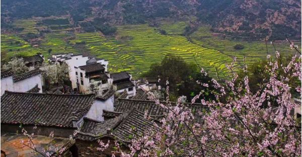 金黃色的花兒從層層梯田沿著山谷流成了海洋。粉墻黛瓦的村落里桃花紅、梨花白,還有那滿山的樹(shù)木和曲折幽靜的小路。
