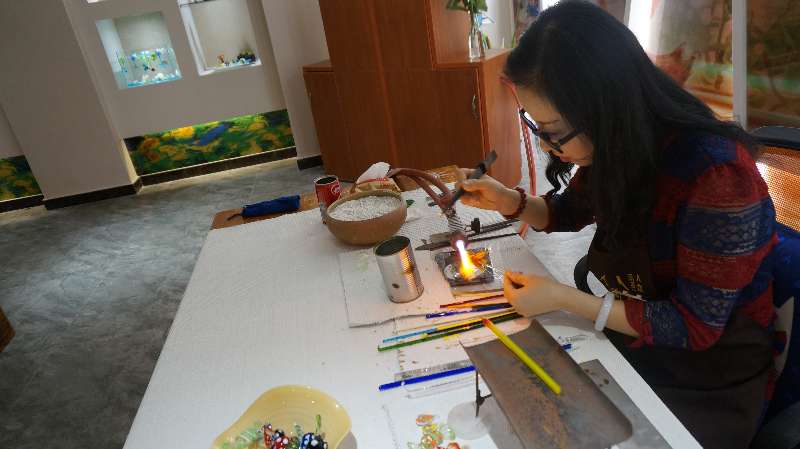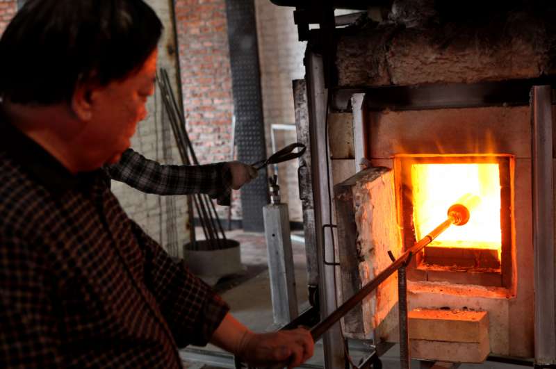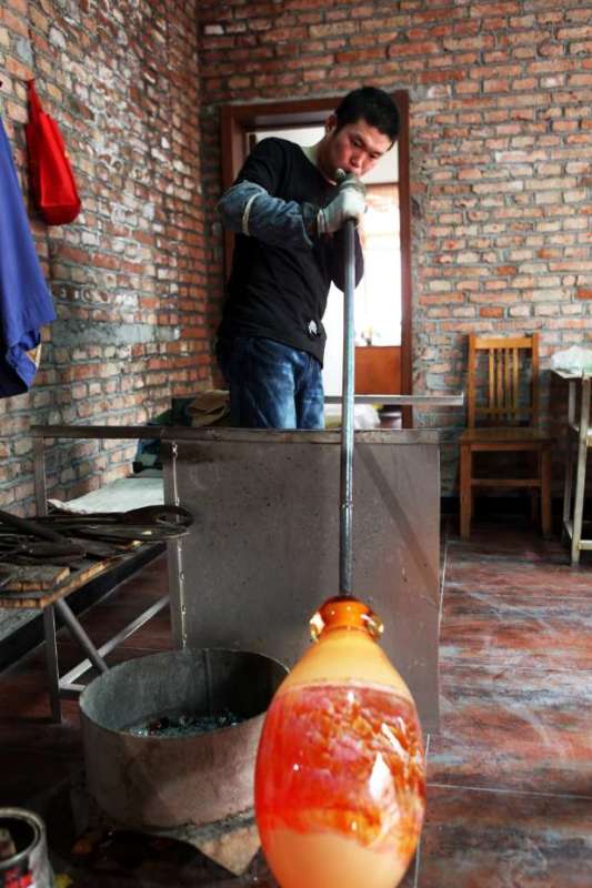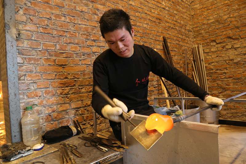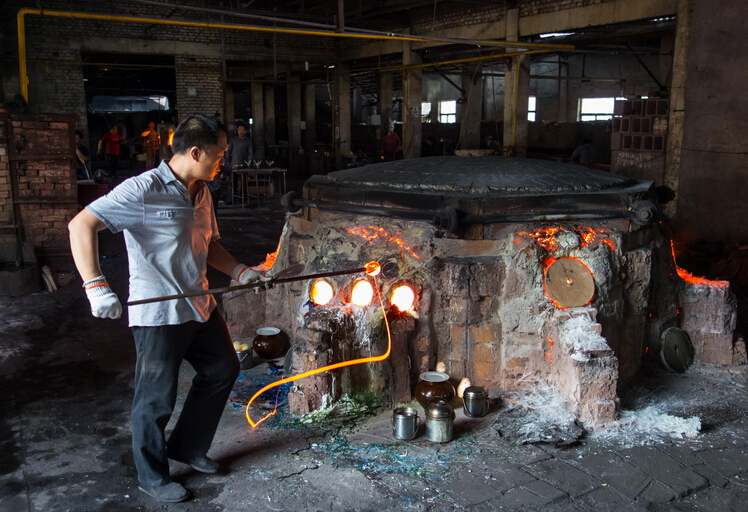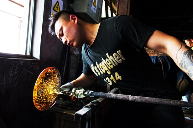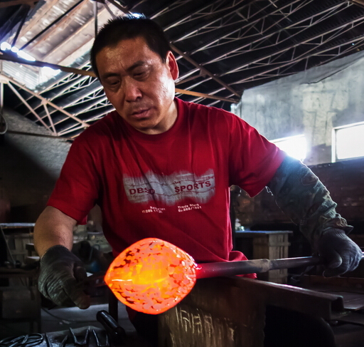 全程拍攝大爐琉璃制作,博山是琉璃之鄉(xiāng),保留傳承了琉璃加工的傳統(tǒng)技藝,并在此基礎(chǔ)上又自己的開拓創(chuàng)新。琉璃的制作工藝相當復雜,火里來、水里去,要幾十道工序才能完成,古法琉璃的精品制作,相當費時,有的光制作過程就要十幾二十天,而且主要依靠手工制作。八卦爐,爐里的溫度在1400-1600度,工作車間內(nèi)的溫度能達到50攝氏度左右。還有傳說琉璃是一個叫路申的博山人在用八卦爐煉丹的時候偶然發(fā)現(xiàn)的,觀其在經(jīng)過烈火煅燒之后還可以晶瑩剔透,遂以長生不老之丹為名進獻給當時的國君,并置于朝堂以消滅災禍。所以佩戴琉璃小飾品還有去災避禍的用處。大師提取原料吹制的過程,都是大師們用空心的管根據(jù)顏色的需要從爐口中提取,然后用空心管吹制。在吹制的過程中,溫度就會下降,然后再上回溫爐進行加工。