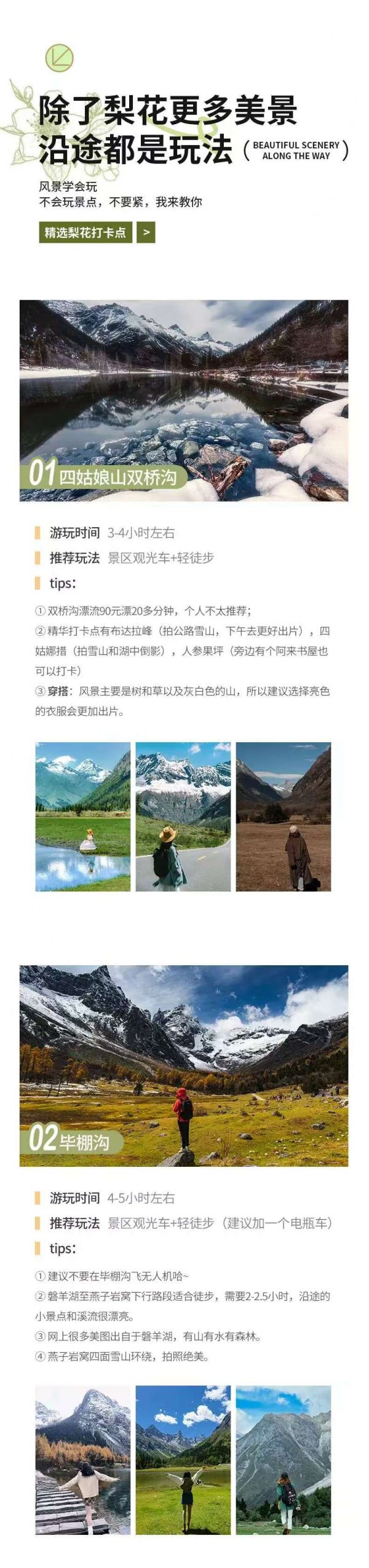 早餐后前往【四姑娘山雙橋溝】換乘觀光車游覽,溝內(nèi)兩面皆是山,卻山山不同,溝內(nèi)處處皆景,而景景有別,真可謂“橫看成嶺側(cè)成峰,遠(yuǎn)近高低各不同”。在長(zhǎng)達(dá)40余公里的溝內(nèi),雪山比比皆是,從畫(huà)屏口的【鍋莊山】到【攆魚(yú)壩】的犀牛望月、企鵝嘴、尖刀山等等,依次排列了十幾座海撥4000多米以上的雪山。一路往里面走,前后左右,雪山盡入眼底,站在溝谷任何一處地方,均可360°無(wú)死角欣賞雪山。游覽完雙橋溝吃過(guò)午餐前往本次梨花開(kāi)的最繁茂的地點(diǎn)【神仙包】,經(jīng)過(guò)喀爾鄉(xiāng),前往【神仙包】,一路美景不斷,也是觀賞梨花最好的地方。可以把車開(kāi)到神仙包背后的山腰上,在這里可以目睹神仙包的全貌和大金川河,褐黑的土地,黃色的莊稼和其他顏色共同組成一幅幅非常漂亮的天然圖畫(huà)。
