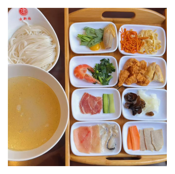 - 湯:用豬筒骨、老母雞等食材長時間熬制而成,湯鮮味美、滾燙濃郁。