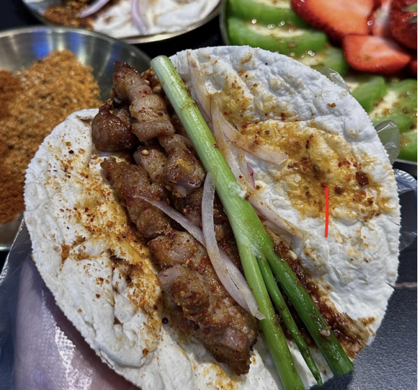 淄博燒烤獨特的“小烤爐+肉卷小餅+蔥+醬”吃法,是其風(fēng)靡全國的制勝法寶 。每個餐桌都配備一個小火爐,服務(wù)員會將七八分熟的烤串送到桌上,接下來就輪到顧客親自上陣。在小火爐上,烤串嗞啦冒油,將肉一把擼下,用巴掌大、烙至起泡的小餅一包,再加上脆嫩的山東嫩蔥,灑上自己調(diào)配的辣醬等蘸料,一口下去,麥香、肉香、蔥香與蘸料的香味完美融合,碳水化合物解油解膩,豐富多樣的配料刺激著味蕾,形成了獨特的“淄博Taco”。