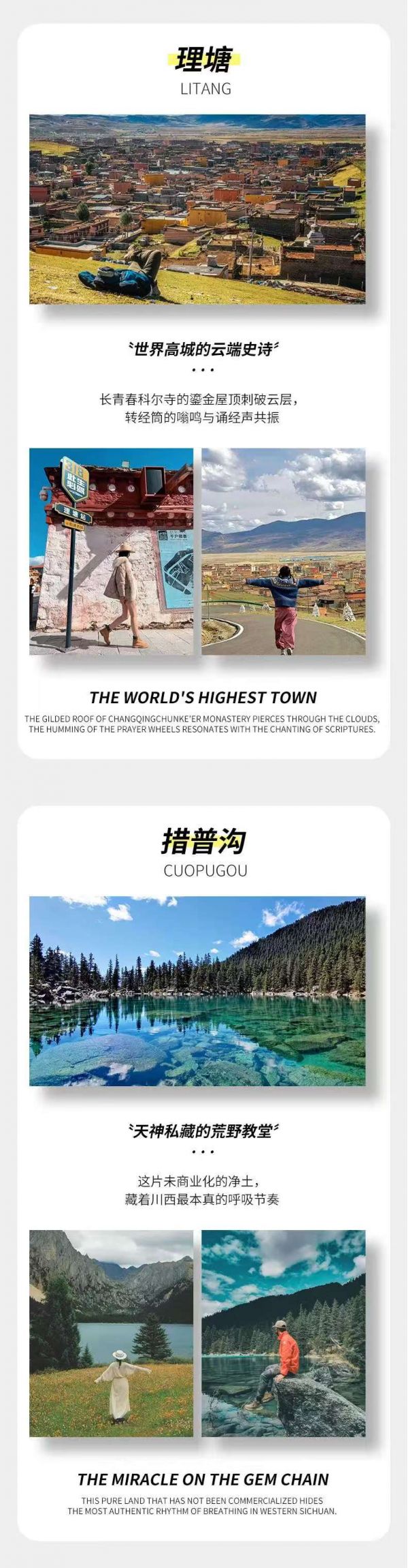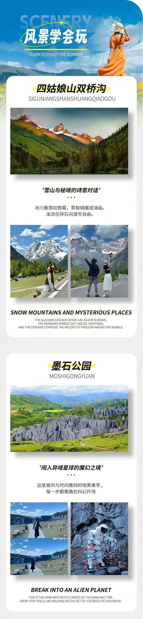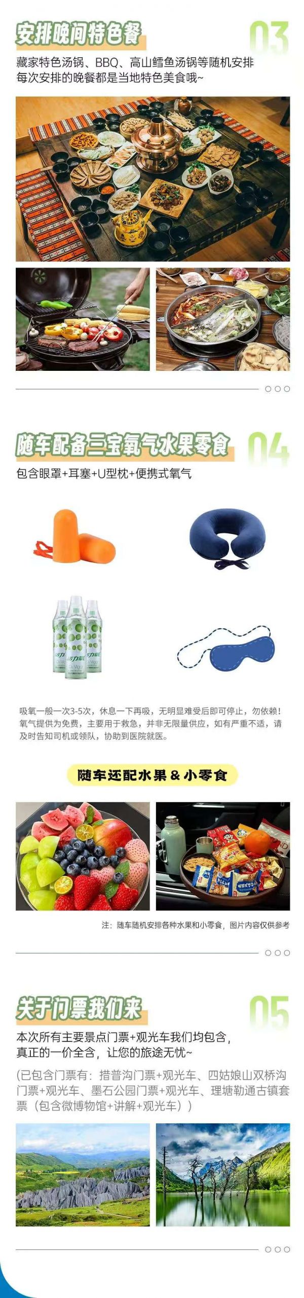 包含措普溝門票+觀光車、四姑娘山雙橋溝門票+觀光車、墨石公園門票+觀光車、理塘勒通古鎮(zhèn)套票(包含微博物館+講解+觀光車)