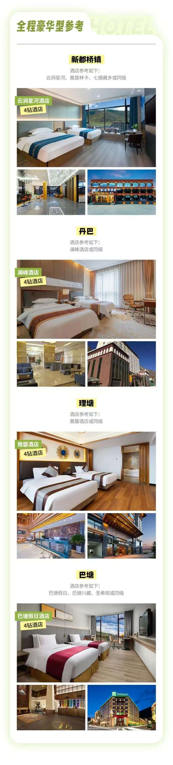 行程所列住宿地5晚住宿(輕奢型和豪華型酒店任選其一,具體價格詳情查看團期價格或咨詢客服了解詳情),每人1床位(含成都集合日4鉆酒店1晚、不住不退不換不指定)具體了解團期價格。