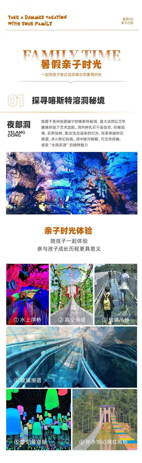 上午:酒店早餐后乘車前往探洞【夜郎洞】(成人兒童均已包含景區(qū)內(nèi)套票:水上浮橋—高空滑道—玻璃吊橋—玻璃滑道—夢幻星空屋—步步驚心網(wǎng)紅橋),隱匿于貴州安順鎮(zhèn)寧的喀斯特秘境,是大自然億萬年雕琢的地下藝術(shù)宮殿。洞內(nèi)鐘乳石千姿百態(tài),石幔如瀑、石筍如林,配合流光溢彩的燈光,宛若穿越時(shí)空隧道,步入奇幻仙境。洞中暗河蜿蜒,可泛舟探幽,感受“水陸雙游”的獨(dú)特魅力。還有各項(xiàng)體驗(yàn)項(xiàng)目: