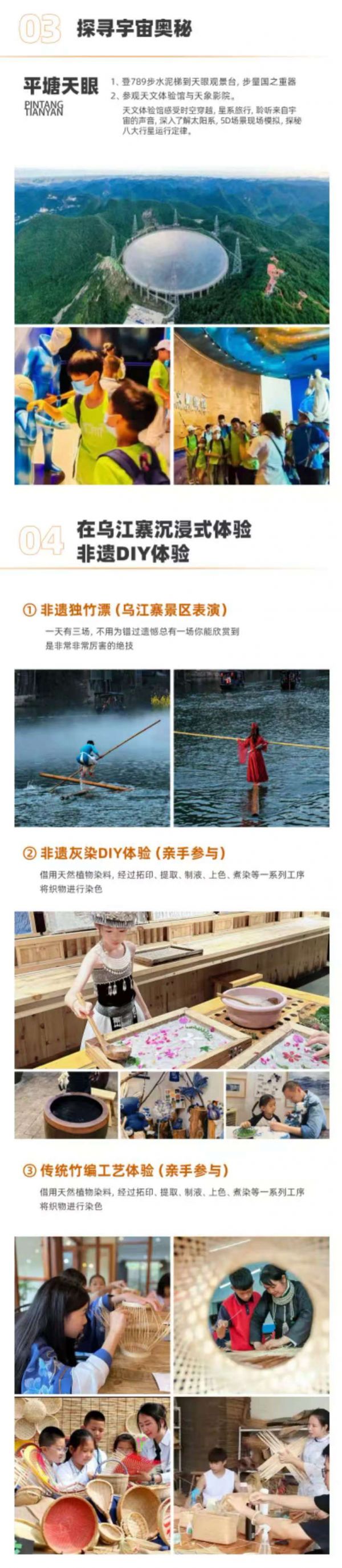 上午:酒店早餐后乘車前往游覽【中國天眼】景區(qū)(成人兒童均不含景區(qū)擺渡車50元/人、必須消費(fèi)項(xiàng)目,敬請自理,兒童超過1.2米含1.2米需補(bǔ)景區(qū)套票60元/人)天眼口徑有500米,有近30個(gè)足球場大的接收面積,主反射面的面積達(dá)25萬平方米。當(dāng)你真正走近中國天眼,才能感受到這個(gè)人工建筑的廣闊與巍峨,驚嘆人類的巧奪天工。只有綜合國力強(qiáng)大的國家才能有實(shí)力建造出如此浩大的工程,不由得心生一股國家自豪感。中國天眼科普基地所售的【套票包含F(xiàn)AST觀景臺、天文體驗(yàn)館和天象影院】,大多游客的游覽路線是含F(xiàn)AST觀景臺—天文體驗(yàn)館—天象影院,順著“上山—下山”的順序游覽,十分清晰明確。