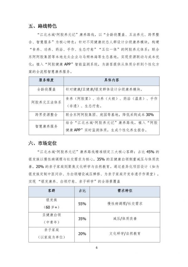 “江北水城·阿膠養(yǎng)元記”康養(yǎng)路線精準鎖定三大核心客群:占比45%的銀發(fā)族以慢性病調理與社交需求為核心,35%的亞健康白領側重減壓與體質改善,20%的親子家庭則聚焦文化研學與自然教育。通過差異化項目設計(如為銀發(fā)族定制中醫(yī)問診、為白領增設減壓禪修、為親子家庭開發(fā)非遺手作課堂),實現(xiàn)“銀發(fā)康養(yǎng)、白領療愈、親子研學”的全場景覆蓋。
