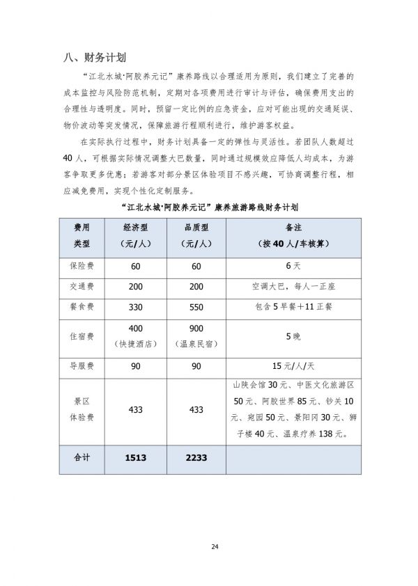 “江北水城·阿膠養(yǎng)元記”康養(yǎng)旅游路線財務計劃